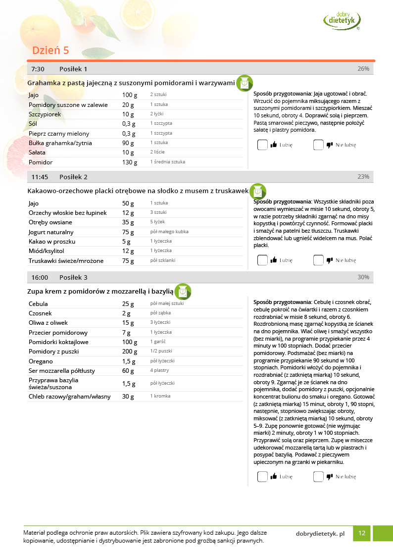 • w formie precyzyjnych jadłospisów wielodniowych (na każdy dzień miesiąca jest opracowany osobny jadłospis). Tutaj nie musisz zastanawiać się co zjeść każdego dnia, gdyż będziesz mieć dokładnie wszystko rozplanowane.